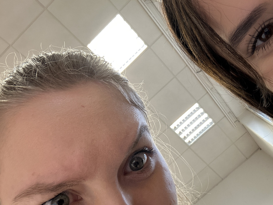 An indoor, close-up, low-angle photograph captures the upper facial features of two individuals, with their heads positioned above the camera's perspective. The individual on the left exhibits fair skin, light-colored hair pulled back, and light-colored eyes, with a small dark blemish visible on the forehead. The individual on the right displays fair skin, dark brown hair styled forward, and dark brown eyes. Both subjects present defined eyebrows and visible eyelashes, and are looking downwards into the camera lens. The background consists of a white modular grid ceiling with square tiles. Multiple rectangular fluorescent light fixtures are integrated into the ceiling, emitting bright white light; one prominent fixture is visible in the upper right quadrant and another in the lower left quadrant. The scene is situated in the city of Strasbourg, France.