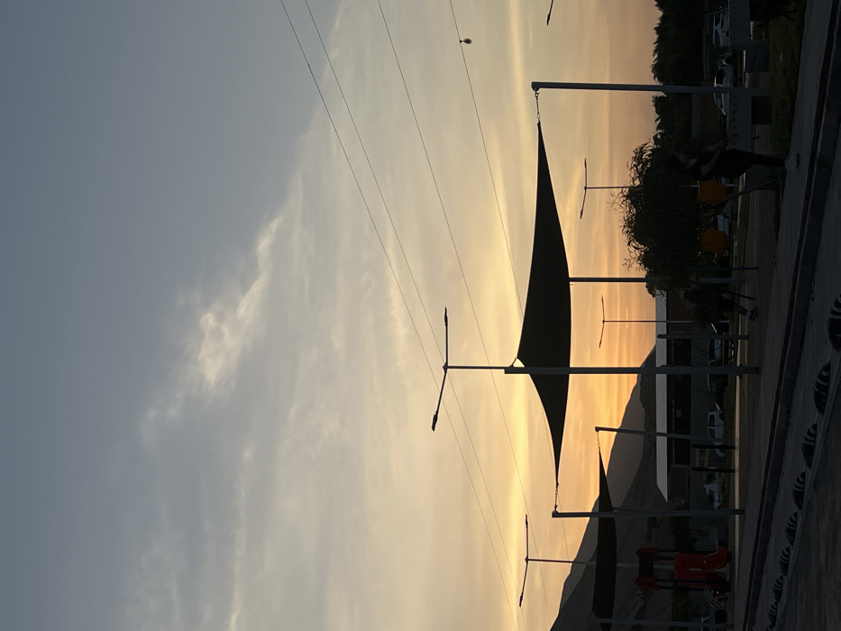 The image captures a public park scene at dusk or dawn in Arica, Chile, illuminated by a warm, low sun. The sky transitions from a pale blue at the top to a gradient of orange and yellow near the horizon, with sparse, wispy clouds visible. Several dark, rectangular shade sails are prominently featured, supported by tall poles. Interspersed among these structures are modern streetlights with horizontal LED fixtures. Overhead, multiple thin power lines stretch across the upper midground. In the foreground, a paved area with low, rounded concrete barriers is visible. The midground contains a recreational space. On the left, a red playground slide structure is partially visible behind one of the shade sails. To the right, two human figures are present, largely silhouetted. One individual stands near a small, dark tree and appears to be interacting with a dark, small animal, possibly a dog, which is low to the ground. Another individual is positioned further back and to the left of the tree, partially obscured. A third, smaller silhouette is visible near the red playground structure. In the background, beyond the park structures, various parked vehicles are discernible, along with what appear to be low-rise buildings. Distinct hills or mountains form the distant horizon line, silhouetted against the bright sky. The overall lighting casts long shadows and highlights the silhouettes of the structures and figures.