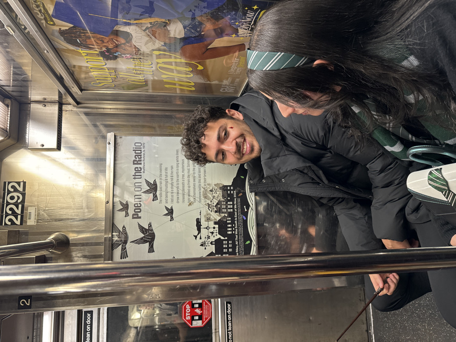 The scene is inside a New York City, United States subway car, identifiable by its stainless steel interior, car number "2292," and a "2" indicating the line on the door, along with a "STOP" sign. A male subject, appearing to be in his 20s-30s with curly dark hair, wears a black puffer jacket and has a small red, tear-shaped mark on his left cheek. He smiles while looking towards a female subject on his right, who is partially visible from behind. The female has long dark hair and wears a green and silver striped headband, a matching scarf, and a white shoe with a similar striped accent. The male holds a dark-colored wand in his right hand. Their attire and objects suggest a Harry Potter theme, implying a shared interest or activity. Two advertisements are visible on the car walls: one for "Poem on the Radio" by Matthew Rohrer featuring birds and a landscape, and another for CUNY with a person holding a diploma.