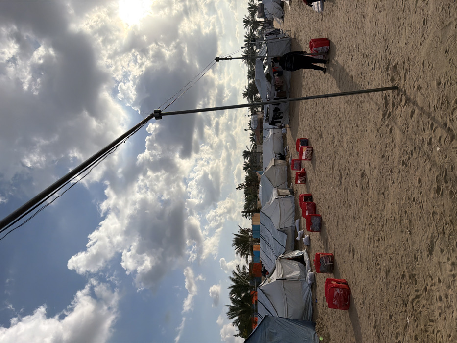 An outdoor scene in a-Zawayda, Palestinian Territory, depicts a temporary settlement under a partly cloudy sky with prominent sunlight from the upper right. The foreground and mid-ground consist of light brown sand, showing numerous footprints. A dark-colored, possibly metal, utility pole stands diagonally in the foreground, extending upwards and to the right, with dark wires strung across the upper portion of the frame. A second, similar pole is visible further back, supporting the wires. The central and background areas are occupied by multiple rows of white or light-colored canvas tents, varying in size and apparent construction, indicative of a displacement camp. Palm trees are densely clustered behind the tents, especially along the horizon line on both the left and right sides of the image. Between the rows of tents, a pathway of sand is visible. In the mid-ground, approximately ten red, rectangular objects, resembling large bags or containers, are lined up on the sand, extending from the left towards the center. On the right side of the mid-ground, a single individual, dressed in dark clothing (dark jacket, dark pants), stands facing away from the camera, next to another similar red object. Clothes are visibly hanging to dry on a line outside a tent further back on the right. White sacks or bundles are visible on the ground near the entrance of a tent on the far left. Shadows from the poles, tents, and the individual are cast towards the left and foreground, consistent with the sun's position.