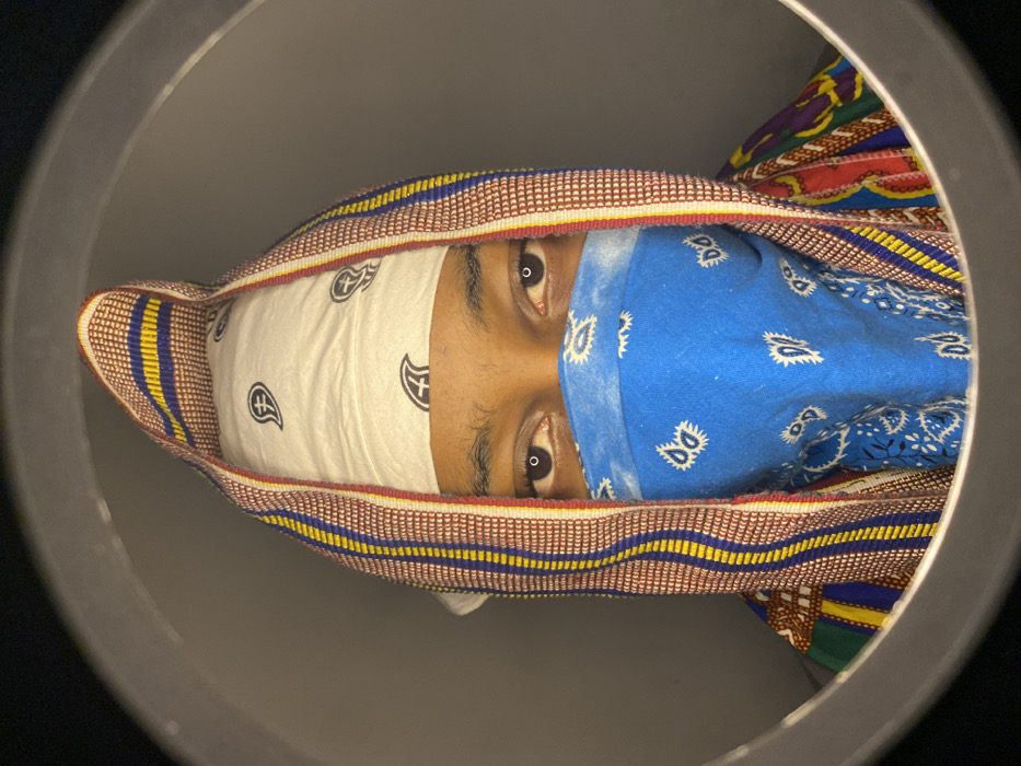A person's face is framed within a circular light, with only their eyes and forehead visible. The person is wearing a white paisley-patterned bandanna on one side and a blue one on the other, beneath a colorful, woven head covering with red, yellow, and blue stripes. The head covering extends beyond the face, revealing more of the woven material in vibrant patterns and colors. The background is a dark, neutral color.