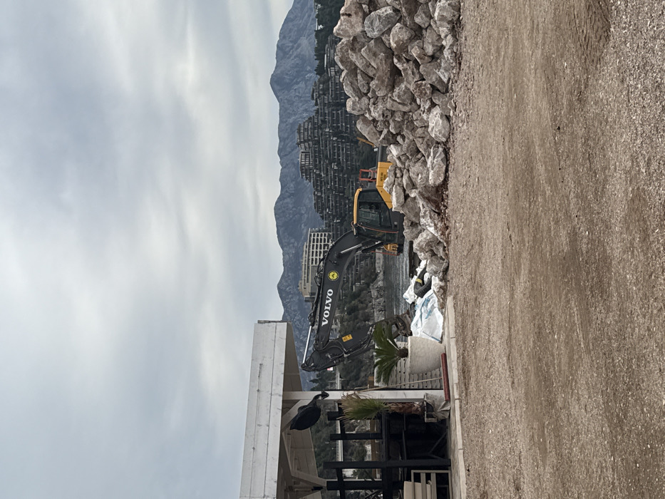 The image depicts a construction or renovation site on the coast of Budva, Montenegro. In the foreground, a brown, disturbed earth surface leads to a large pile of light-colored rocks and rubble on the right. To the left, a white, open-sided wooden structure, possibly a pavilion or a beach club component, is partially visible, with dark furniture and a large white planter containing a palm tree underneath. A yellow and black Volvo excavator is positioned near the water's edge, partially obscured by the rock pile and the structure. Its arm is extended towards the water. The sea is visible behind the excavator. In the mid-distance, across the water, various buildings are visible, most notably the terraced, multi-level structures of the Dukley Gardens complex. A range of mountains under an overcast sky forms the distant horizon. No individuals are present in the scene.