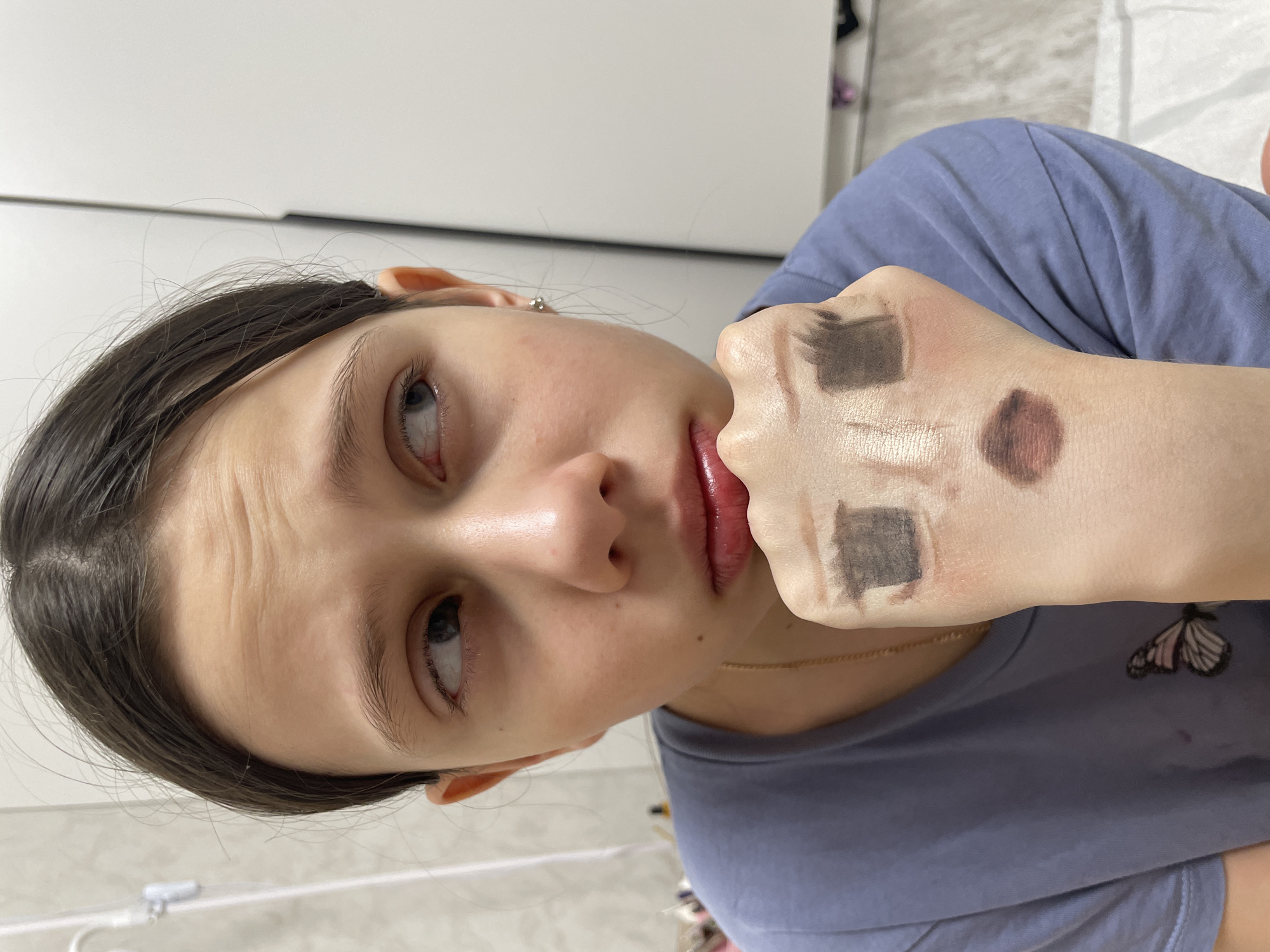A young female, appearing to be a teenager, is depicted from the upper chest in an indoor setting. She has dark hair, a light complexion, and her brow is furrowed as her blue-grey eyes gaze towards her left (viewer's right). She wears a light blue short-sleeved t-shirt with a white and black butterfly graphic on the lower right, and a thin gold chain is visible around her neck. Small stud earrings are present in her ears. Her right hand is raised, with the back of her hand positioned near her chin. On the back of this hand, a stylized face has been drawn with cosmetics, featuring two dark, roughly square shapes for eyes, a lighter, wider swatch above them, and a dark, smudged oval for a mouth. Additional cosmetic smudges are present on the hand. The background on the left consists of a light-colored wall or tiled surface with a vertical white pipe or fixture. The background on the right is a plain white panel, possibly a cabinet door, with a visible vertical seam. The ambient lighting suggests an interior room, possibly a bathroom or bedroom. The depicted scene is understood to be located in Izhevsk, Russia, although no specific geographical markers are visible within the image frame.