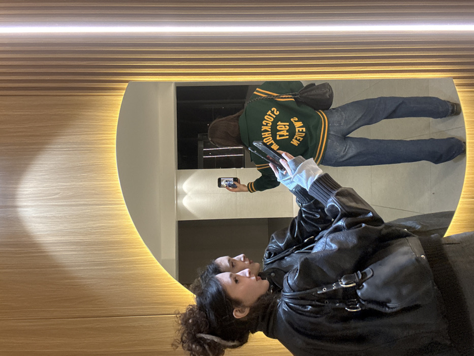 A person in a black leather jacket stands in front of a round mirror, reflected in which is another person wearing a green and yellow bomber jacket with "STOCKHOLM" and "SWEDEN" printed on the back