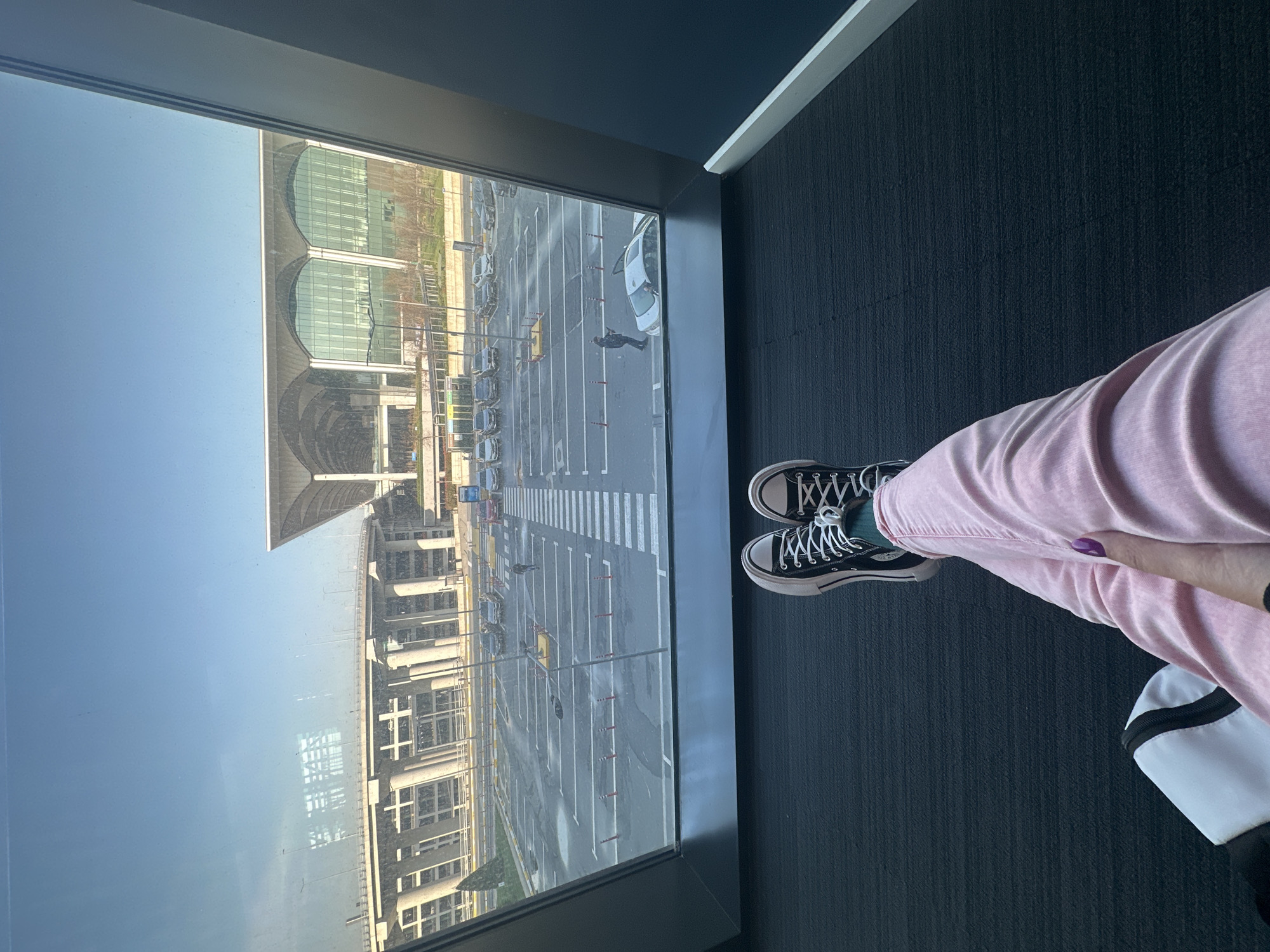 - "The image displays a first-person perspective from an indoor lounge or waiting area looking out through a large, slanted window onto an airport environment" by FM-7mrtA2, licensed under CC BY 4.0