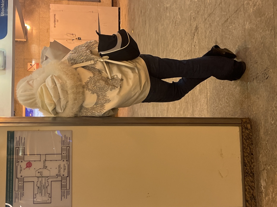 A woman is leaning against a wall. She has her head resting on the surface. The woman wears dark pants, a light-colored jacket with fur trim and a silver design on the back, and a black bag with white trim. A map of the station is affixed to the wall, and it's visible in the lower left corner of the frame. The wall has a light beige color. The floor is a weathered gray.