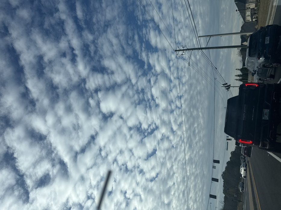 A daytime scene reveals a densely clouded sky above a road. Power lines stretch across the image, interspersed with traffic lights. A black GMC Denali is prominent in the foreground, followed by a line of cars in traffic. Buildings and trees are visible in the distance against the sky. The abundance of clouds creates a textured appearance, with varying shades of blue and white.