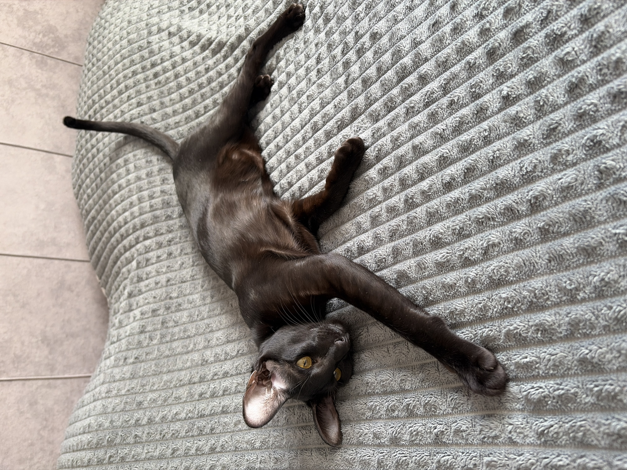 A dark brown, sleek cat with yellow eyes lies on its back on a gray textured cushion. The cat is oriented with its head towards the bottom of the frame. Its tail extends towards the upper left, and its limbs are splayed out in different directions. The background includes a section of a tile floor on the left. The city is not discernible from the image.