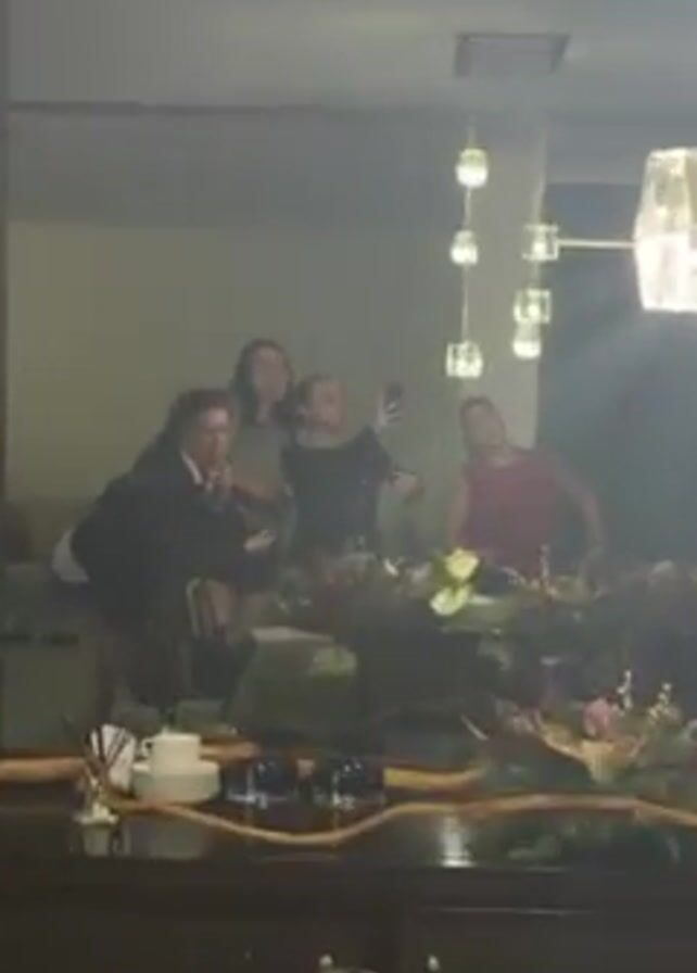 A group of four young women are visible in the reflection of a large mirror panel in a brightly lit room. One woman is holding up a smartphone, seemingly taking a photo or video of the group. The other women are posing or looking at the phone. A long dining table is in the foreground, decorated with floral arrangements and candles. A chandelier with multiple square glass fixtures hangs above the table. A Christmas tree is visible in the background, near a seating area with a couch. The room appears to be a dining or living area in a modern home.