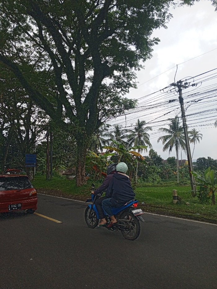 The image depicts a rural or semi-rural road scene in Qorday, Kazakhstan, under an overcast sky. In the foreground, a dark asphalt road occupies the lower portion of the frame, with a faded yellow double-line marking partially visible on the left. On the left side of the road, a red hatchback car is partially visible, facing away from the camera. Its rear license plate reads "J 1182 CB". Behind the car, a large, mature tree with a dense, dark green canopy and moss-covered branches dominates the upper left and central portions of the image. A smaller utility pole or signpost with a dark blue rectangular sign is visible near the car. To the right of the car, two individuals are riding a blue motorcycle away from the camera. The driver wears a dark jacket and a dark helmet. The passenger, seated behind, wears a dark blue jacket and a pale green helmet, holding onto the driver. Both individuals are operating the motorcycle in a forward direction. The driver's feet, possibly bare or in sandals, are visible on the footpegs. The right side of the scene features lush green vegetation, including several palm trees and broad-leafed plants (possibly banana trees), extending into the midground and background. A prominent utility pole with numerous overhead wires stands on the right side of the road. Beyond the immediate vegetation, a patch of green field is visible, and in the far background, a building with a light-colored roof can be faintly discerned among dense foliage. A small, light-colored marker post is situated at the edge of the green field on the right.