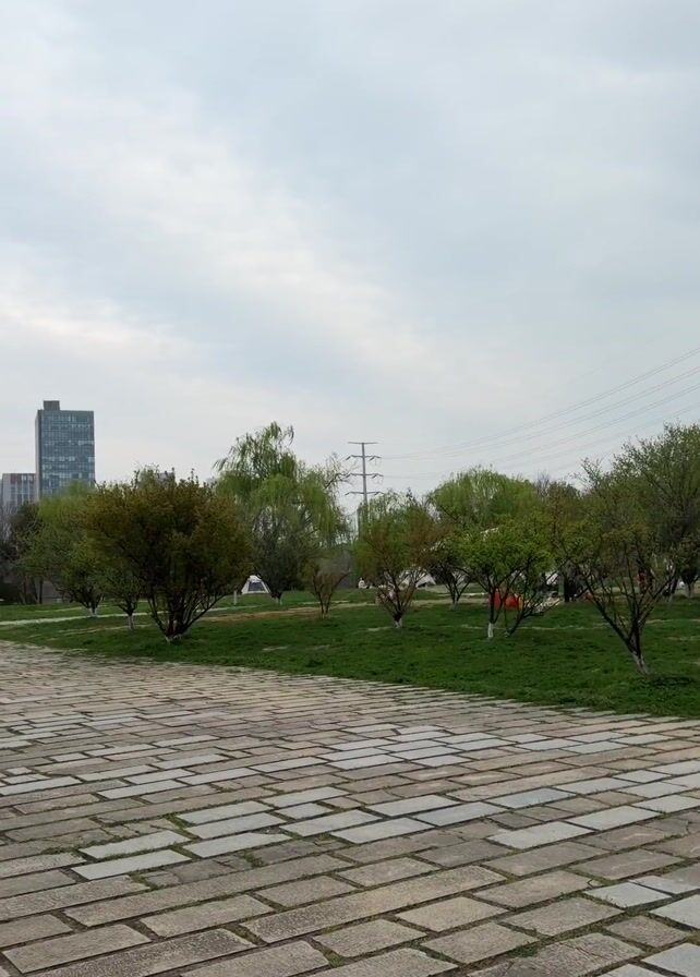 park scene on a cloudy day. A stone-paved path leads into the park. There are trees and grass on either side of the path. In the distance, people are gathered, some with tents set up. Power lines are visible overhead. A building is visible in the far background.