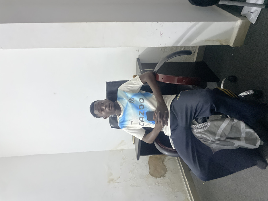 A young man sits in a black office chair wearing a white and blue jersey with dark sweatpants. He holds a dark object in his hands. He is in a room with white walls that show some water damage. A black desk is behind the chair with some items on top. The floor is gray and appears to be made of dark material. The image is rotated slightly.