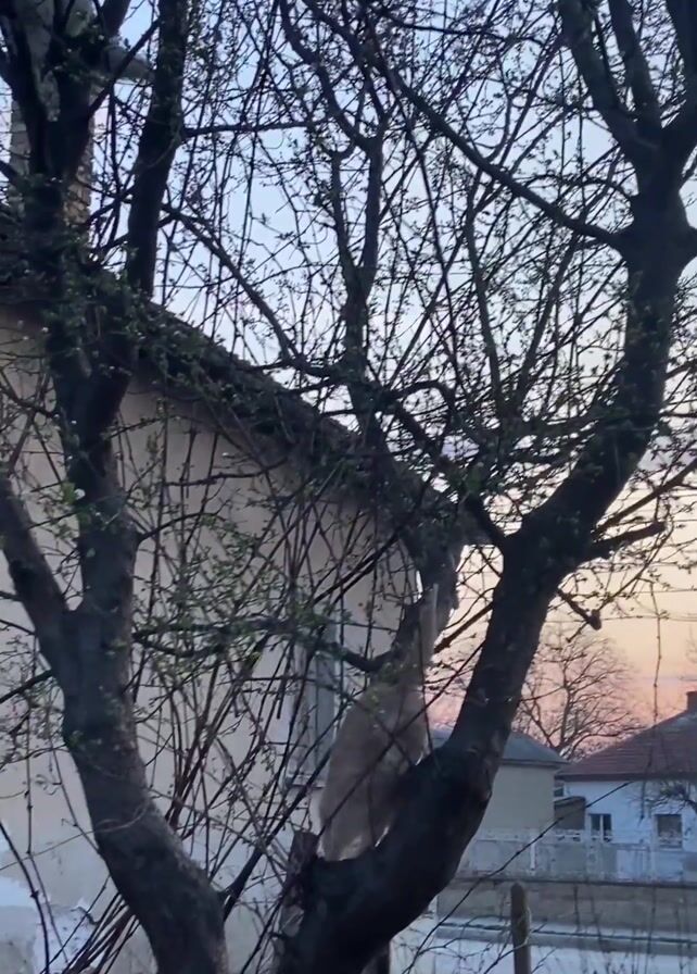 light-colored cat climbing in a bare tree. The tree is in front of a one-story building, with a chimney visible on the left side of the frame. Beyond the building and tree, there are houses in the background. The sky is a mix of blue and orange, suggesting either sunrise or sunset. The branches of the tree are detailed, and one can see the cat moving up into the higher branches.