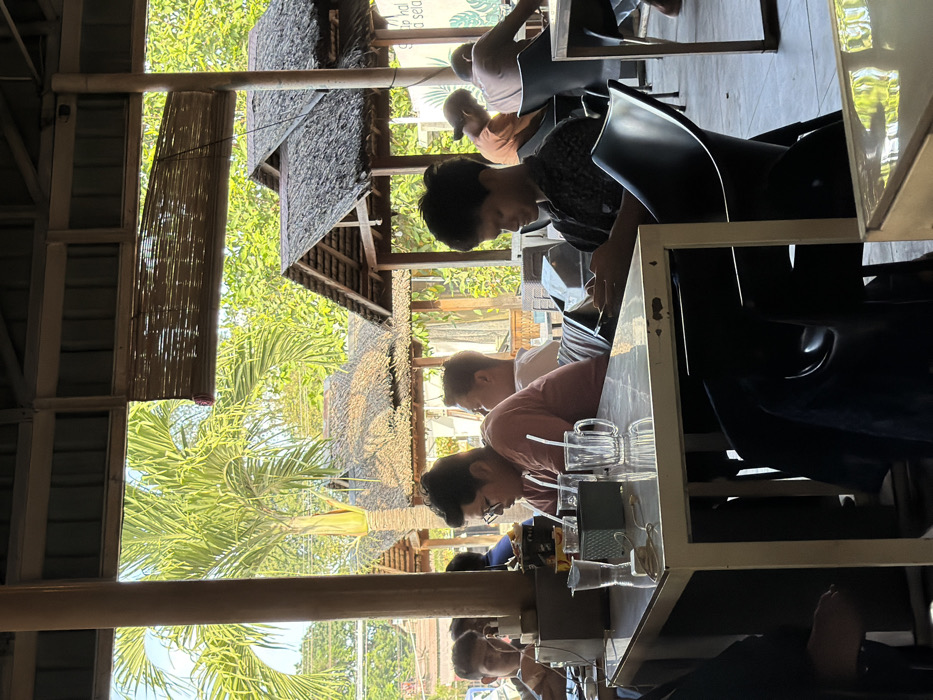 The scene depicts an open-air café or restaurant located in Lhokseumawe, Indonesia, characterized by a predominantly wooden and thatched-roof construction