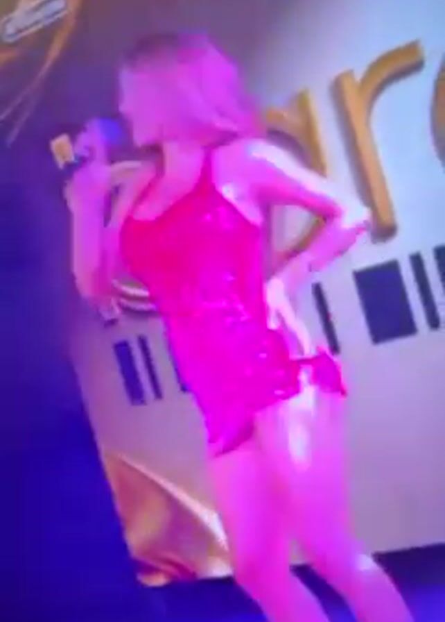 A woman is singing on stage, wearing a short red dress. She is holding a microphone in her hand and dancing while she sings. The stage is lit with blue and purple lights. Behind her is a sign that says "bar". The woman has long blonde hair.