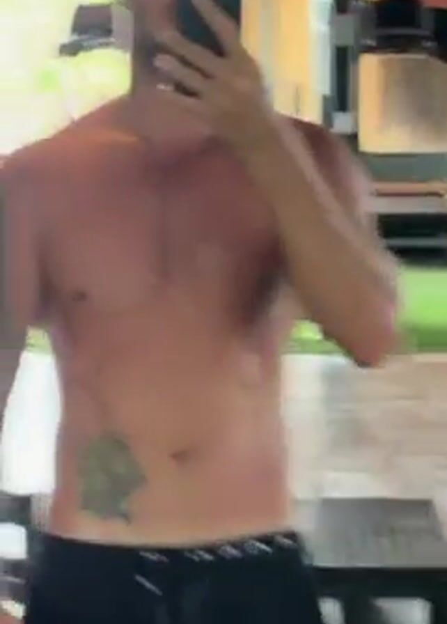 A man with short brown hair is standing shirtless in a gym, taking a selfie in the mirror with his phone