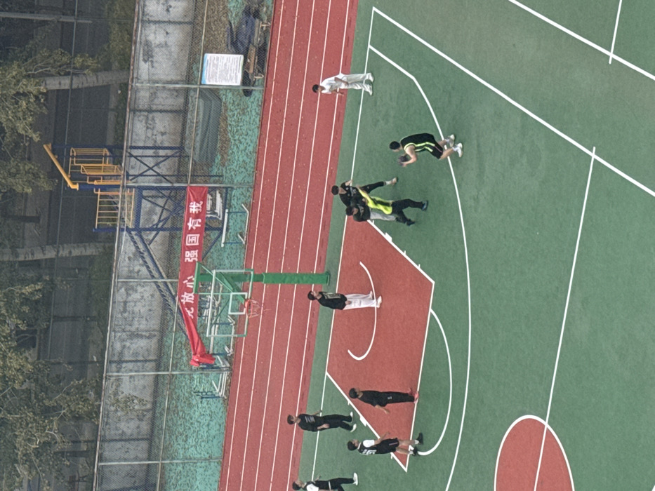 This image depicts an outdoor sports facility located in Daxing District, China. The scene primarily features a basketball court and a running track. The basketball court occupies the central and lower portions of the frame, characterized by a green surface with white boundary lines and a rectangular red key area, including a semicircle. A single green-poled basketball hoop with a transparent backboard and red net is positioned at the far end of this court. To the left of the basketball court, a red running track with white lanes is visible. Approximately ten male individuals, appearing to be young adults, are present. On the basketball court, two individuals in the lower right quadrant are engaged in active play: one in a black and neon green sleeveless top holds a basketball, preparing an action, while another in a black jacket and neon yellow vest is positioned defensively in front of him. Other individuals are standing or walking on the court and track; these include one in a white and black sleeveless top on the far left, two in black attire near the left key, one in a black long-sleeve shirt and white pants near the center key, and one in all white attire near the running track on the right. In the background, a chain-link fence runs horizontally across the scene, topped by a concrete wall. Behind this fence, deciduous trees with sparse foliage are visible. A blue and yellow playground structure, possibly a slide and climbing frame, is situated behind the running track on the right side of the fence. A red banner, partially folded, is affixed to the fence above the basketball hoop, displaying white Chinese characters that translate to "Please rest assured, a strong nation has me." A rectangular white informational sign with black text is mounted on the fence to the right of the banner.