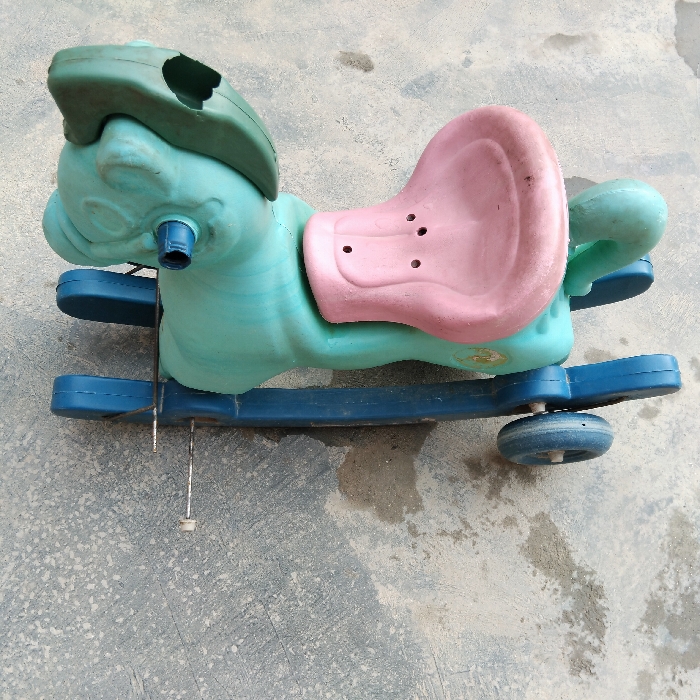 - "A teal-colored plastic children's ride-on toy, shaped like an elephant, is depicted lying on its left side on a grey concrete surface" by FM-gh1oY2, licensed under CC BY 4.0