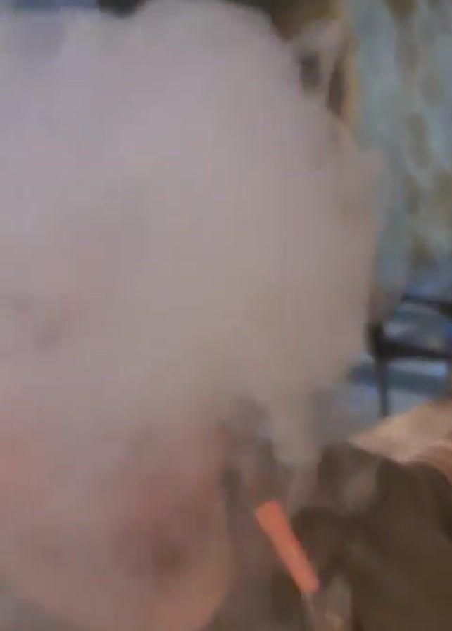 A person is smoking a hookah, exhaling a large cloud of smoke towards the camera
