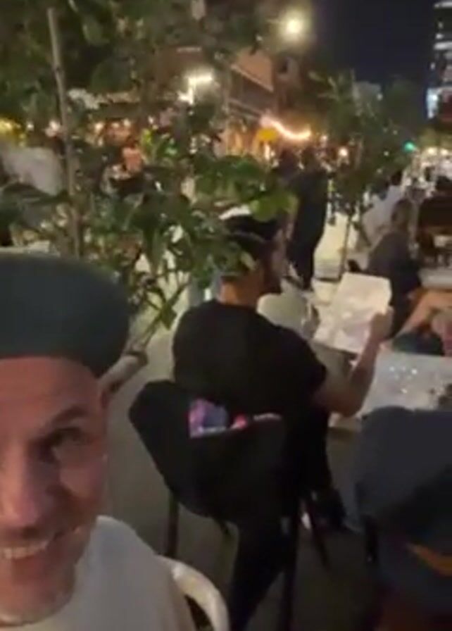 man in a white shirt and a green cap, smiling and holding the camera up for a selfie. Behind him, an outdoor dining area is bustling with people at tables under trees adorned with fairy lights. Some people are looking at menus, while others are walking by on the sidewalk. The scene is set at night, illuminated by streetlights and the lights from nearby buildings. Sounds of cheering and chanting can be heard in the background.