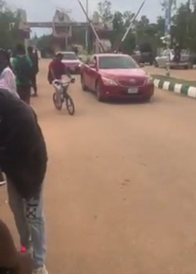 man riding a bicycle on a road leading through an archway or gate. The man is wearing a maroon shirt, light-colored pants with a design, and a yellow cap. He also appears to be wearing gloves. The bicycle is black with pink accents. Several other people are standing on the side of the road, including the person filming. There are a few cars parked or driving in the background. The road appears to be made of dirt or gravel. The sky is overcast. The archway has some sort of emblem on it.
