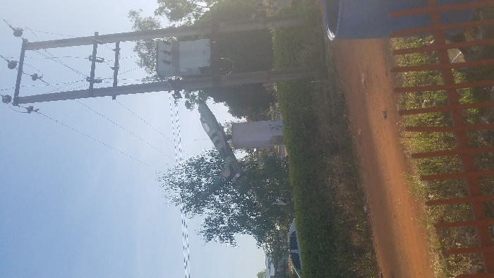 The scene depicts an outdoor environment in Bar Jirgi Summa, Nigeria, under a clear, pale blue sky. In the foreground, an orange metal fence runs horizontally, partially obscured by green grass. Directly behind the fence is an unpaved reddish-brown dirt path. On the far right, a partial view of a blue cylindrical object, possibly a barrel or tank, is visible. In the midground, a prominent feature is a fixed-wing aircraft, painted in green and brown camouflage with lighter underparts and a circular insignia on its fuselage, mounted on a tall, light-colored concrete pedestal. The aircraft is angled upwards, simulating flight. To the left of the aircraft, a white vehicle, appearing to be a sedan, is partially visible behind green foliage. A large, leafy green tree stands behind and slightly to the right of the aircraft monument. To the right of the tree, a utility pole structure with multiple power lines extending upwards and to the left is visible. A gray electrical transformer is mounted on the right pole of this structure. A dense, low green hedge separates the dirt path from the area containing the monument and utility infrastructure. The background consists of distant trees and faint structures under the clear sky. No individuals are present.