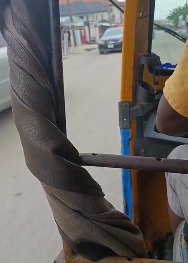 view from inside a motorized tricycle, also known as a "keke" or "tuk-tuk", moving on a street with light traffic