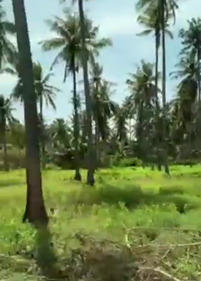 tropical landscape with numerous tall palm trees. The ground is covered in green grass and low-lying vegetation. The sky is light blue with some white clouds. The camera appears to be moving, possibly from a car or other vehicle, as the scenery passes by. The overall impression is that of a warm, tropical climate. A person can be heard speaking in the background.