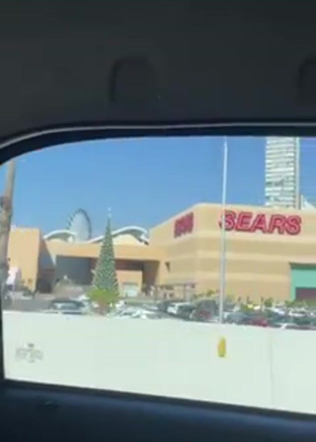 From inside a moving vehicle, a view through the window shows a Sears department store under a clear blue sky. Palm trees and a large Christmas tree stand near the entrance. Cars fill the parking lot in front of the building. In the distance, a Ferris wheel can be seen. The vehicle is moving along a highway, separated from the Sears property by a concrete barrier. The view shifts briefly to show the Sears store further down the road, partially obscured by trees and bushes.