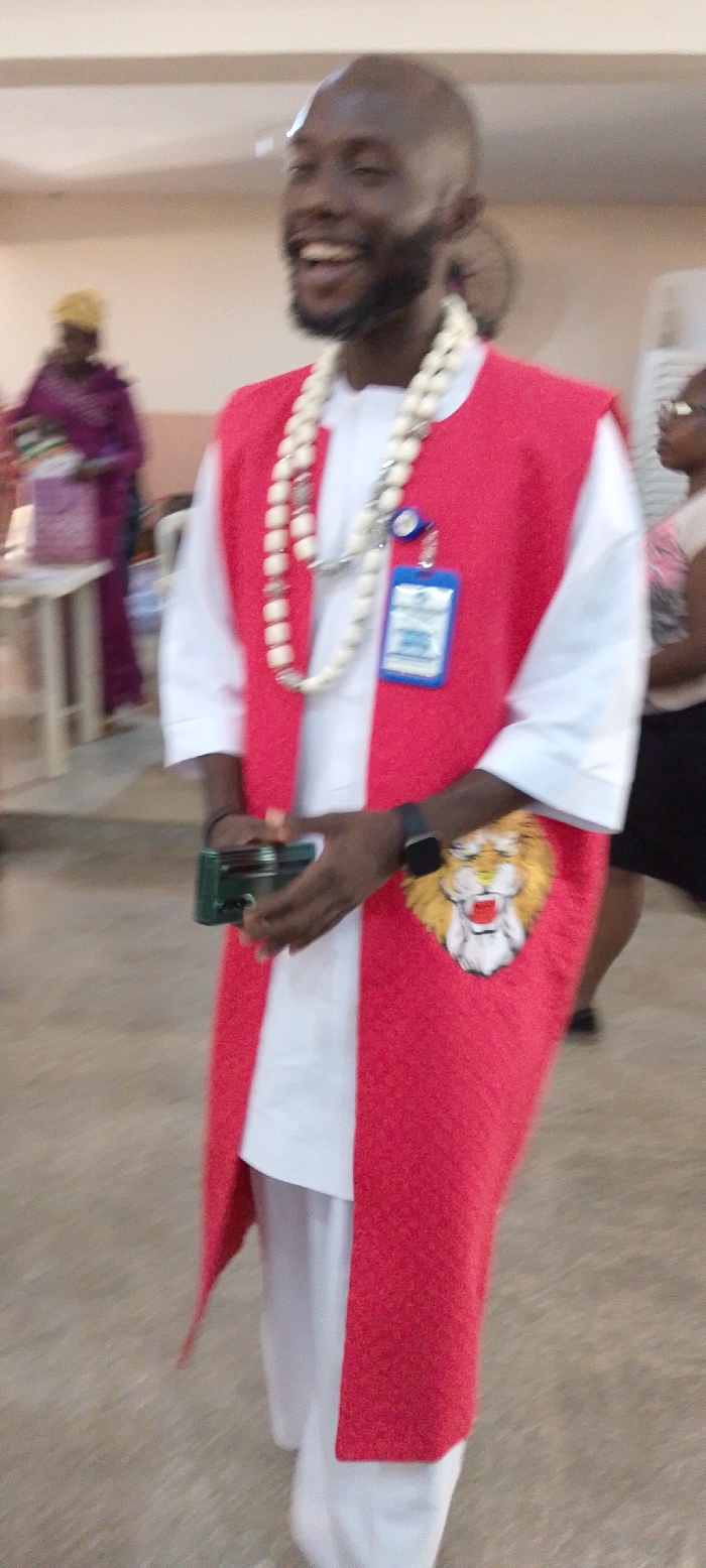 An adult male, dark-skinned with a bald head and short beard, stands smiling broadly in an indoor setting in Kubwa, Nigeria