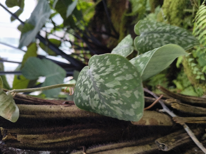 - "A close-up showcases lush greenery, including heart-shaped leaves with silver variegation, possibly a Scindapsus pictus plant" by FM-EceK32, licensed under CC BY 4.0