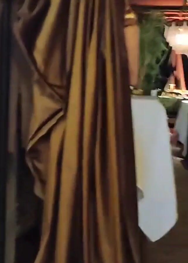 dining room with a whimsical decor. The room has tables with white tablecloths, chairs, plants, and a chandelier. The room also has fairy lights, stars, and a crescent moon hanging from the ceiling.