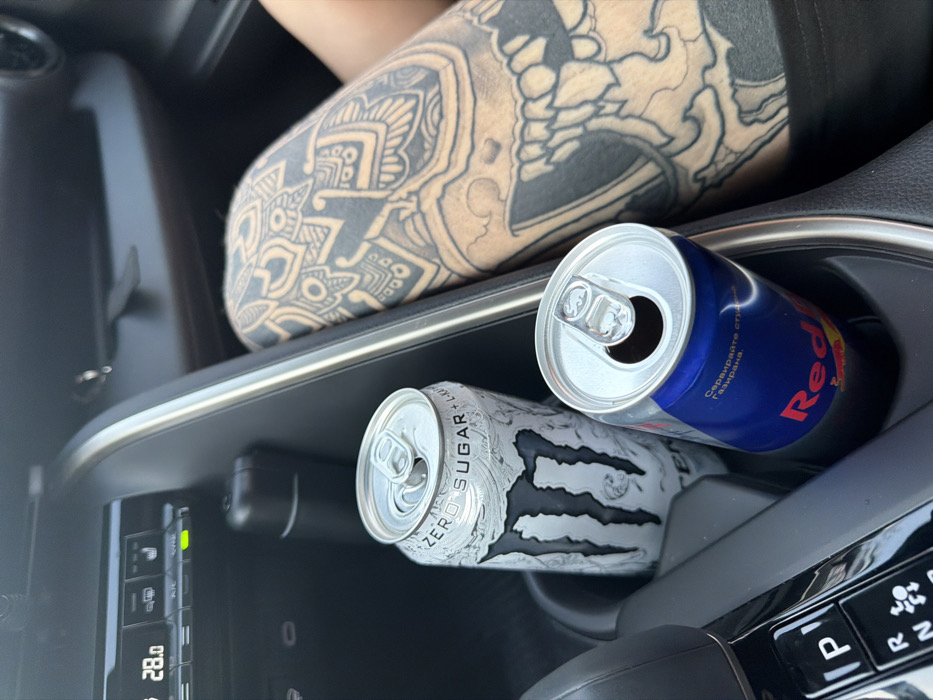 This image depicts the interior of a stationary vehicle, focusing on the center console and the right leg of an occupant. Two open energy drink cans are positioned in the vehicle's cup holders: one white Monster Energy Zero Sugar can and one blue and silver Red Bull can. The Red Bull can features Cyrillic text on its side. The vehicle's gear selector is set to 'P' for Park. A digital display on the dashboard indicates a temperature of 28.0, with a small green indicator light active near climate controls. A dark, cylindrical object is visible in a compartment adjacent to the dashboard controls. The visible right leg of a person, likely seated in the passenger position, is extensively covered with black ink tattoos, including a large mandala-like design on the upper thigh/knee area and a stylized skull or monstrous motif extending below the knee. Dark shorts are visible on the leg. The image provides no visual information to determine a specific location within the city of Sofia, Bulgaria.