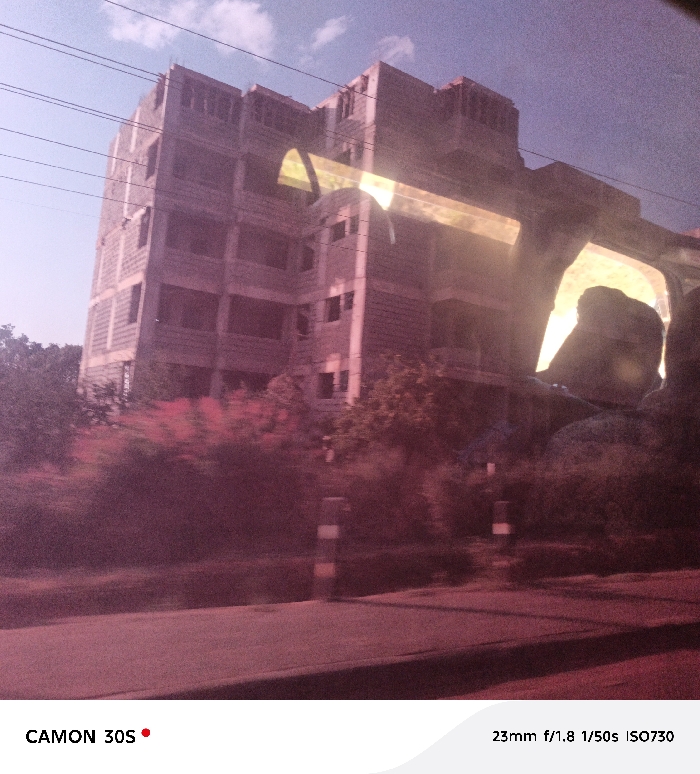 An unfinished brick building dominates the background under a cloudy sky. Foreground is blurred, suggesting motion, with foliage and indistinct objects visible. The image has a red-pink tint. Reflection of faces are visible from the glass of a window. Camera information is visible at the bottom: "CAMON 30S" and "23mm f/1.8 1/50s ISO730".