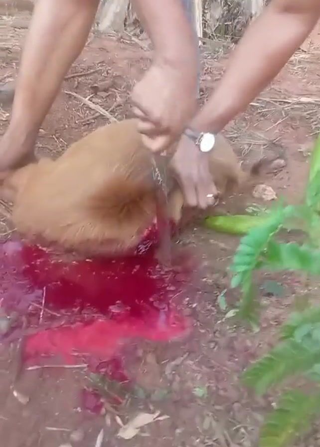 A man is shown outdoors, on a patch of ground covered with dirt and grass, with a pool of blood nearby. He's using a knife to cut into the neck of a dead, light brown goat. The man is wearing a watch on his left wrist. The goat is lying on its side, with its head turned to the side. There is a green vegetable near the goat. The ground is stained with blood.