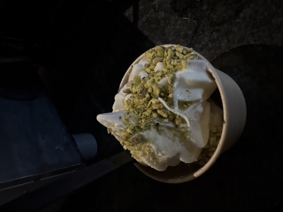 - "A close-up shows a cup filled with white ice cream, heavily sprinkled with chopped pistachios" by FM-pvUaz2, licensed under CC BY 4.0