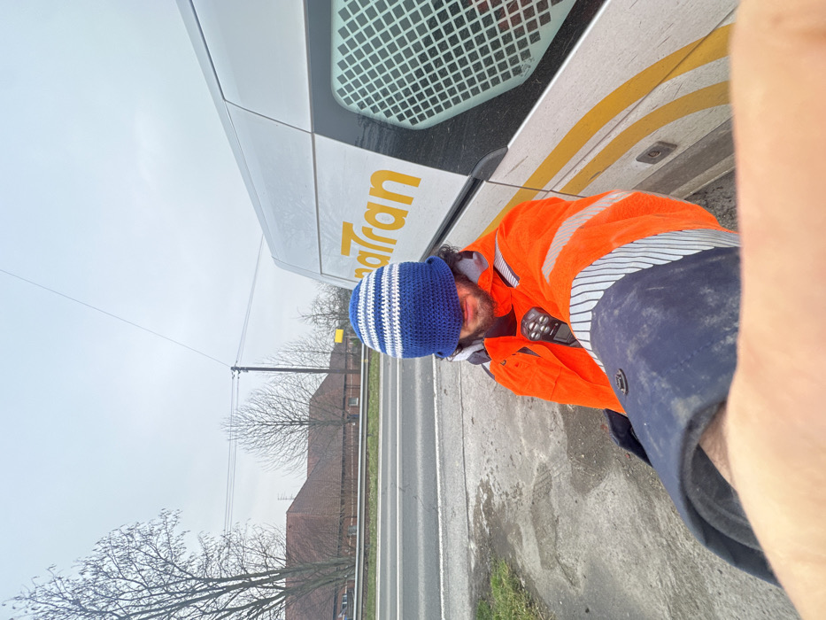 The image captures an individual taking a selfie in Courchelettes, France, on an overcast day. The subject, a male with a visible beard, wears a blue and white striped beanie pulled down to obscure his eyes. He is dressed in an orange high-visibility jacket with grey reflective stripes on the sleeves, beneath which a dark blue garment is visible. A communication device is clipped to the front of the orange jacket. The individual stands on a wet, muddy verge adjacent to a paved road marked with a solid white line. To his right and behind him, a white utility van is parked, displaying yellow "inaTran" branding on its side and a gridded pattern on a rear panel. The background reveals bare-branched deciduous trees, a utility pole with overhead lines, and residential buildings featuring red-tiled roofs, all beneath a grey sky.