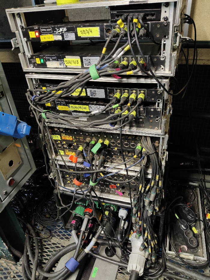 A rack of audio equipment is filled with numerous XLR cables plugged into various devices. The devices are labeled "TOTAL LIGHT," with numbers 1 and 2 visible, along with assigned channels like "1/2/3/4" and "5/6/7/8." Yellow labels indicate IP addresses and other channel assignments, such as "13/14/15/16." Colored tape is used to organize cable bundles. A "D-Link" device is present. The setup features a complex web of cables.