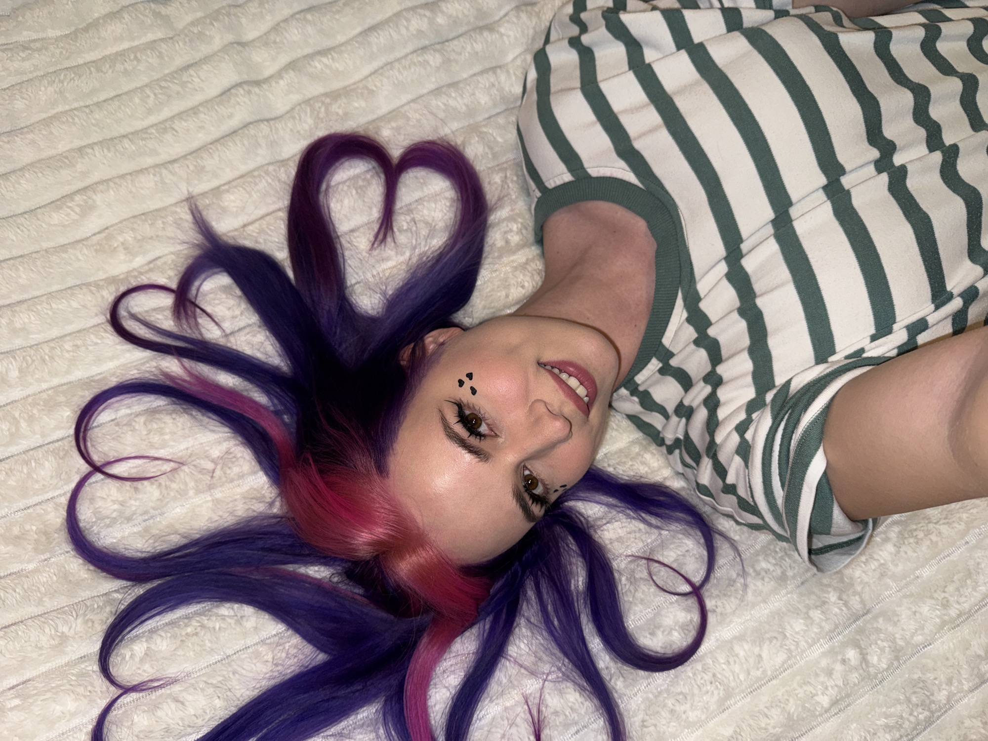 A woman with purple and pink hair, styled into heart shapes, lies on a white, textured blanket