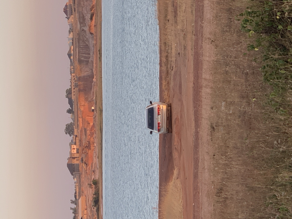 A silver car sits on a dirt road beside a body of water under a serene sky. The water's surface displays subtle ripples. On the opposite side of the water, a tiered landscape features residential buildings and rugged terrain. The dirt road is lined with dry grass, contrasting with the green vegetation on the far right. The car is parked with its rear facing the viewer. The overall impression is one of tranquility.