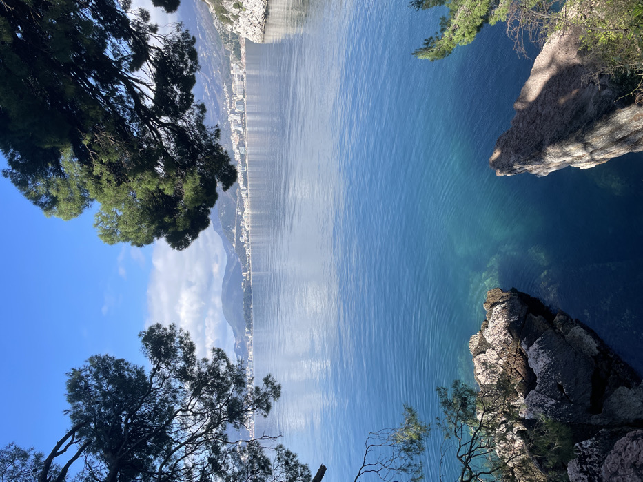 - "The image presents a panoramic coastal view from Sveti Stefan, Montenegro, looking across a body of water towards a distant coastline" by FM-srcYD2, licensed under CC BY 4.0