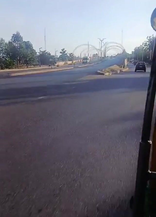 The video, shot from a moving vehicle, shows a wide asphalt road on a sunny day. The road curves slightly upwards toward a bridge adorned with arched supports. Concrete barriers line the road's edges, some bearing graffiti. Sparse vegetation borders the road, with trees and streetlights visible in the distance. A few vehicles can be seen on the road ahead. The camera appears to be mounted on the side of a three-wheeled vehicle, likely an auto-rickshaw.