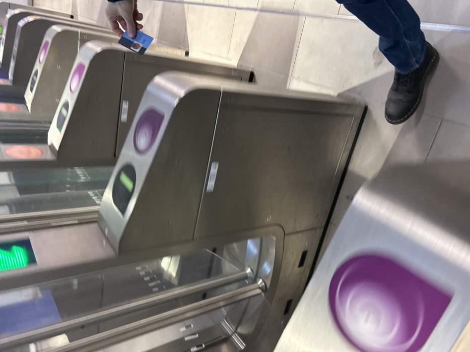 - "The image depicts a row of automatic entry turnstiles inside a public transportation station, identified as part of the Paris Metro or RER system due to the specific design and purple circular branding (indicative of RATP)" by FM-78pcv2, licensed under CC BY 4.0