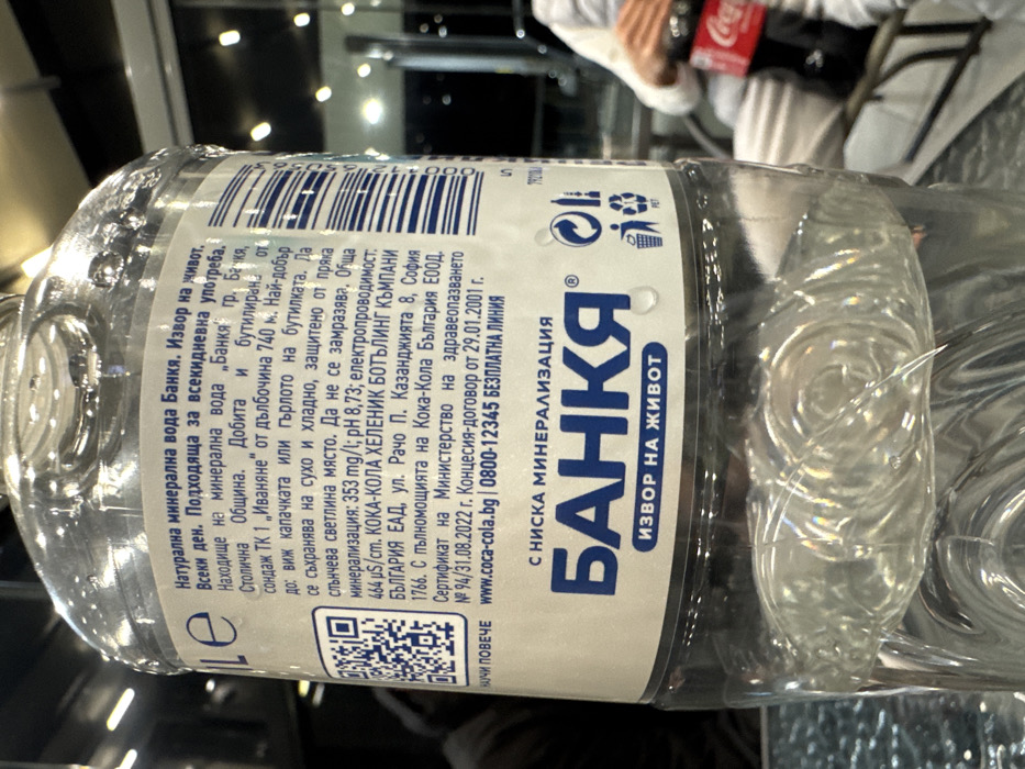 - "The image depicts a close-up, slightly angled view of a partially consumed clear plastic bottle of "БАНКЯ" (BANKYA) natural mineral water, positioned in the foreground on a dark, reflective surface" by FM-2TFXi1, licensed under CC BY 4.0
