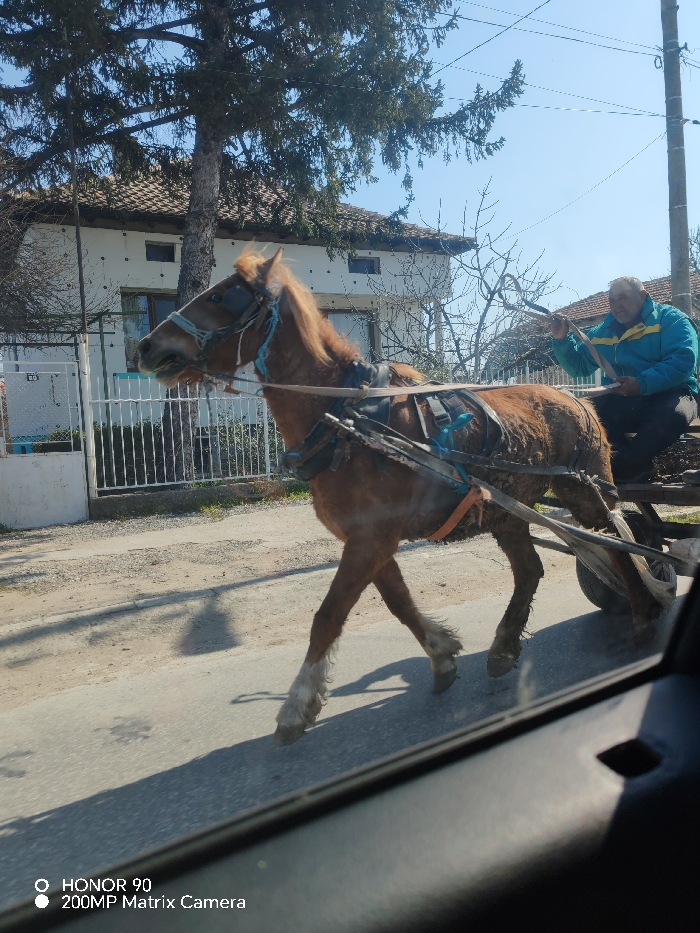 An outdoor scene in Saraia, Bulgaria, on a clear, sunny day shows an older male driving a horse-drawn cart on a paved street