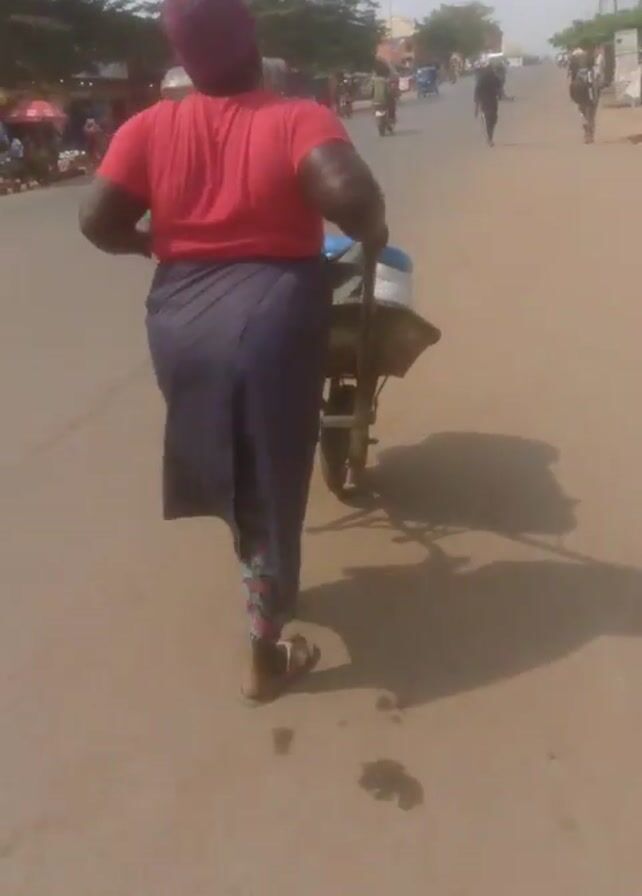 person walking away from the camera, pushing a wheelbarrow along a street. The person is wearing a red shirt, a long grey skirt, and a purple head covering. They are also wearing sandals. The wheelbarrow appears to be carrying a container. The street has buildings and trees on either side, and there are other people, motorcycles, and vehicles moving along the street. The video appears to have been taken on a sunny day.