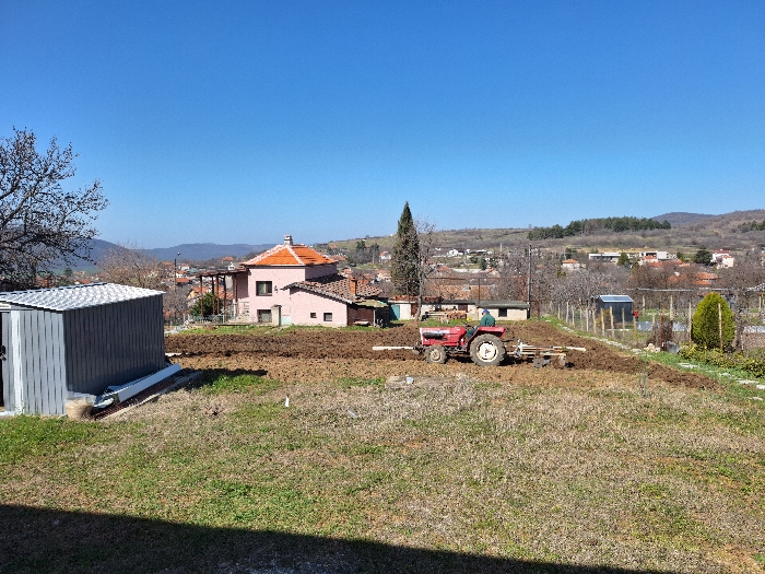 This image depicts an outdoor scene in Elhovo, Bulgaria, under a clear blue sky. In the immediate foreground, a patch of dry grass covers the lower section of the frame. To the left, a corrugated metal shed, predominantly gray with a lighter gray roof and dark rectangular opening, stands on a slightly elevated concrete base. A bare tree branch extends into the upper left corner. The midground features a recently tilled, dark brown earth plot. A single individual, clad in a green long-sleeved top, operates a small, red, two-wheel drive tractor fitted with a rear-mounted tilling or plowing implement. The tractor is positioned facing right, actively working the soil. Behind the tilled field, a light pink, two-story house with an orange tile roof and a visible balcony is prominent on the left. Scattered residential buildings with varying roof colors and styles are visible throughout the midground and background, indicating a populated area. A tall, slender evergreen tree stands to the right of the pink house. Further right, a smaller, dark-colored shed-like structure and some garden fencing are discernible. The background consists of rolling hills covered with sparse vegetation and trees, extending to the horizon. The overall lighting suggests a bright, sunny day.