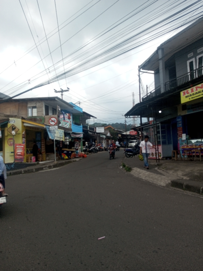 The image depicts a street scene in Kalchini, India, under an overcast sky. The asphalt road, curving gently to the left, occupies the central and foreground portions. On both sides of the street, two-story commercial buildings house various shops with awnings and merchandise displays. On the left, multiple shops are visible, including one with a yellow facade featuring red and white advertisements and another with a blue awning. A "No Parking" sign is affixed to a pole near these establishments. Several motorcycles are parked along the curb. Utility poles with numerous overhead power lines are present on this side, extending across the sky. On the right, a two-story building features a grey upper floor with a dark balcony railing. The ground floor houses a shop identified by a prominent yellow sign reading "RINA MASAKAN & Maswati N..." with additional text below. Items are displayed outside this shop on shelves. A man in a white t-shirt and blue jeans walks on the sidewalk in front of this shop, carrying a yellow bag in his left hand. Further down the street, other individuals and motorcycles are visible. One person on a motorcycle is seen riding away from the viewer in the middle distance on the road. In the far background, hills are visible, and a communication tower stands on the right. The sky is uniformly cloudy, and a dense network of overhead power lines is visible across the entire upper portion of the frame. A small pink object rests on the asphalt in the foreground.