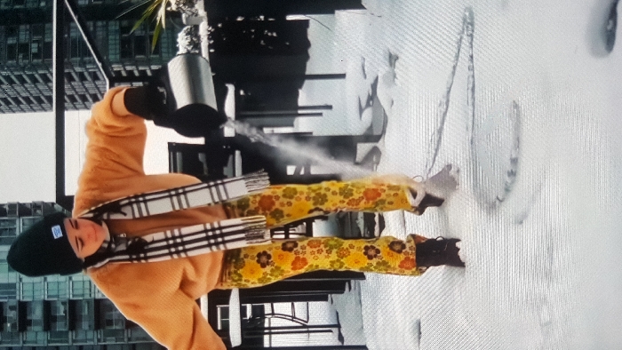 The image displays an outdoor urban environment extensively covered in snow. A single individual, a person appearing to be a young adult female, occupies the center of the frame. She wears a black knit beanie with a white label, a tan-colored fuzzy jacket, a white and black plaid scarf, yellow trousers adorned with a multi-colored floral pattern, and dark boots. Both hands are gloved in black. The individual is actively pouring a substance from a silver metallic pitcher held in her right hand; the substance emerges as a white, misty stream, impacting the snow-covered ground in a curved, trail-like pattern. Her gaze is directed downwards towards this action. In the midground, dark-colored outdoor furniture, including tables and chairs, is partially visible and dusted with snow. A dark metal railing separates the foreground from the background, which is dominated by several modern, high-rise buildings constructed from glass and concrete under an overcast sky. A sparse, broad-leafed plant, also snow-dusted, is visible on the right. This scene is located within the city of Medellín, Colombia, likely on a rooftop terrace or an elevated balcony, given the surrounding urban high-rise architecture. The extensive presence of snow is highly atypical for Medellín's tropical climate, indicating the snow is artificial or the setting is a controlled environment.