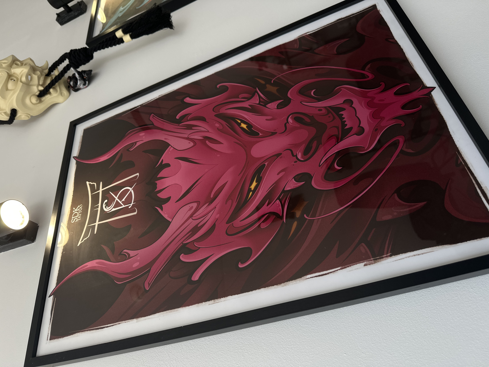 A framed, vertically oriented artwork is displayed on a textured white wall in an interior setting, likely a tattoo studio